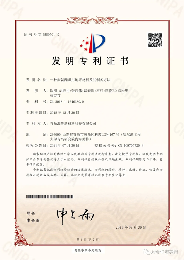 2021年7月30日,青島海洋新材料科技有限公司申請的《一種聚氨酯阻尼地坪材料及其制備方法》發(fā)明專利獲得國家知識產(chǎn)權(quán)局授權(quán),授權(quán)專利號:ZL 2018 1 1646380.0。目前,公司共獲得國家授權(quán)專利33項(xiàng),其中發(fā)明專利31項(xiàng),實(shí)用新型專利1項(xiàng),外觀設(shè)計專利1項(xiàng)。